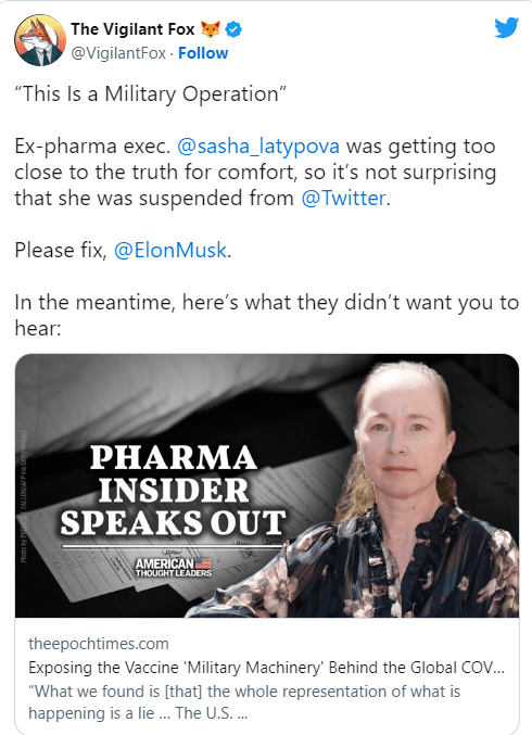 Speaking with Jan Jekielek of The Epoch Times, Latypova explained she previously worked in the pharmaceutical industry and had retired before Covid started.