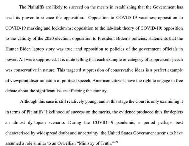 In his dramatic ruling on Tuesday, Donald Trump-appointed Judge Terry A. Doughty said that ‘during the COVID-19 pandemic… the United States Government seems to have assumed a role similar to an Orwellian “Ministry of Truth”‘.