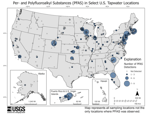This USGS map shows the number of PFAS detected in tap water samples from select sites across the nation. The findings are based on a USGS study of samples taken between 2016 and 2021 from private and public supplies at 716 locations. The map does not represent the only locations in the U.S. with PFAS. (USGS)