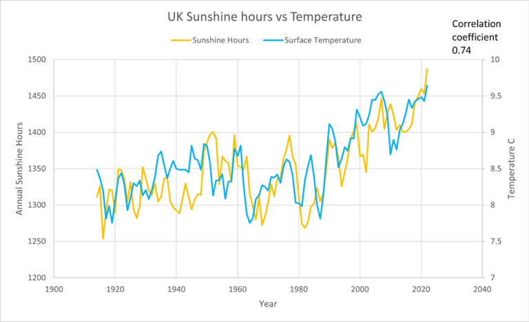 The UK has gotten sunnier over the past century, with temperatures climbing in line. (And to the alarmist blindly brushing this data off, check your bias, ask yourself ‘how is okay for me to ignore this correlation?’)