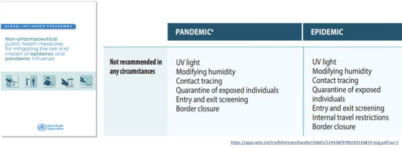 In late 2019, the WHO issued new recommendations for pandemic influenza. Influenza spreads by the same mechanism as Covid-19 (aerosols), with a similar mortality in most people. The WHO stated that it is “not recommended in any circumstances” to undertake contact tracing, quarantine of exposed individuals, entry and exit screening, and border closures. They envisioned that in a severe pandemic it may be necessary to close businesses for up to seven to ten days.