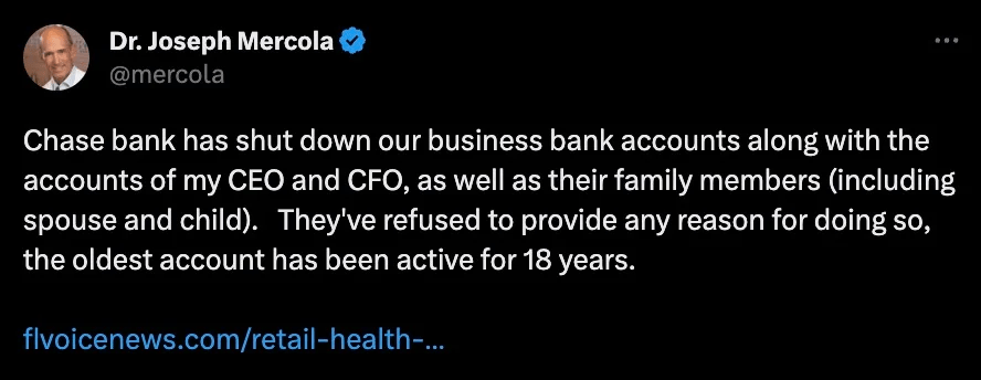 In a recent wave of unexpected closures, JP Morgan Chase has terminated a number of bank accounts associated with Florida-based health retailer, Mercola Market, along with the personal accounts of its employees and their families. The firm’s owner, Dr. Joseph Mercola, is known for his criticism of COVID-19 vaccines and promotion of natural health.