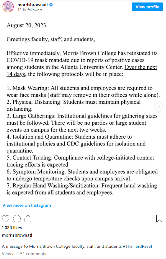 Morris Brown College in Atlanta, Georgia started requiring students and employees to wear face masks on campus this week, just the second week of the new school year.
