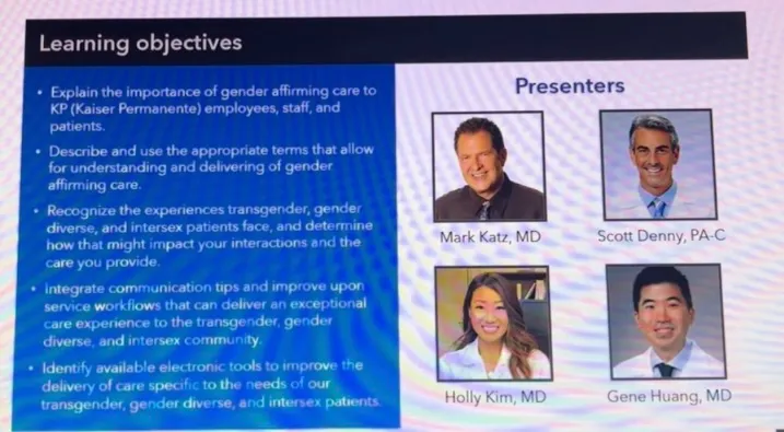 Next, providers employed by KP are required to watch a forty-five minute course featuring a series of videos about Transgender and Gender Diverse care.