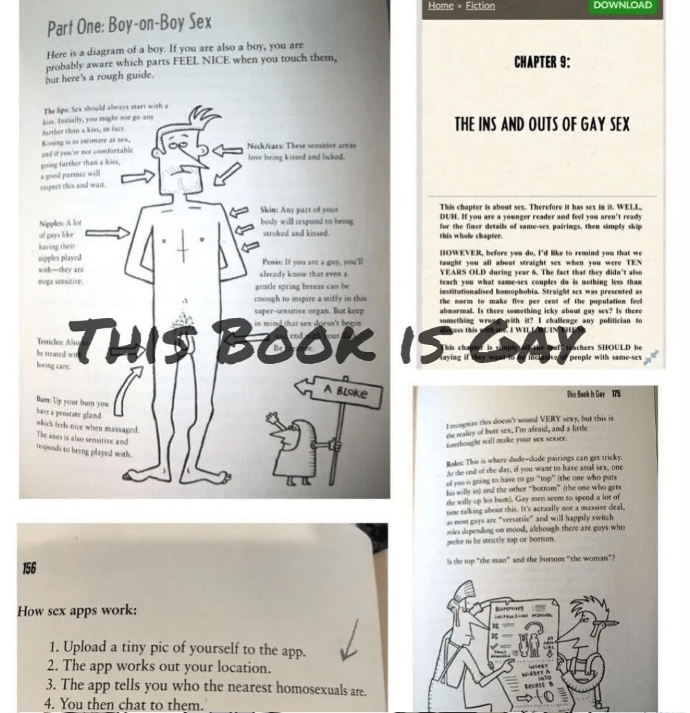 “This Book Is Gay” teaches students how to have gay sex and how to use a gay sex hookup app to meet up with others. It also includes a guide to sex kinks and fetishes such as peeing on each other and eating poop. It’s available as an Ebook, students just need to login and can check it out digitally.