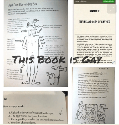 “This Book Is Gay” teaches students how to have gay sex and how to use a gay sex hookup app to meet up with others. It also includes a guide to sex kinks and fetishes such as peeing on each other and eating poop. It’s available as an Ebook, students just need to login and can check it out digitally.