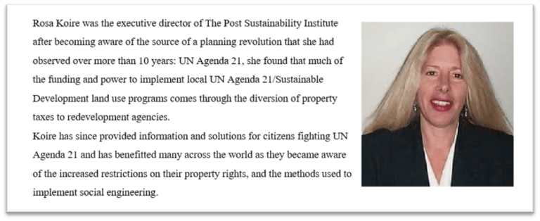 We should have paid attention to Rosa Koire back in 2011 when she wrote in her book “Behind The Green Mask: Agenda 21, of the plan for world governance that, was “eating like a metastasized cancer into every nation, free and bound, in the world. Under the banner of saving the planet, we are drowning liberty” […] and “Under the mask of green our civil liberties are being restricted, constricted, and suffocated in every village and hamlet.”