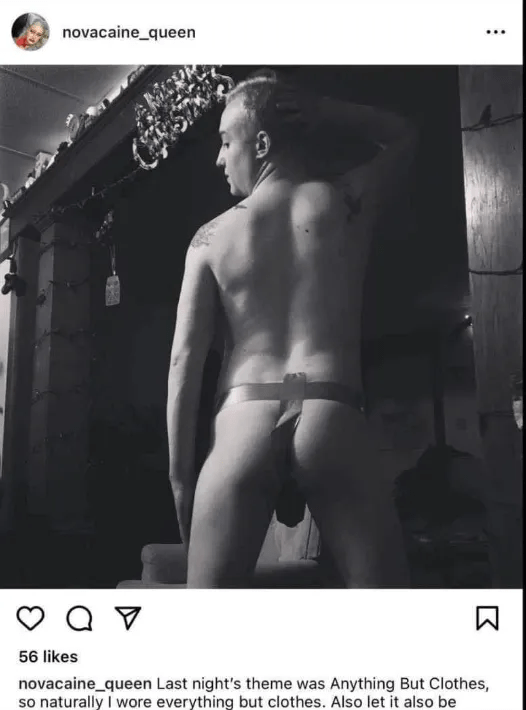 We spoke with a concerned parent within the school who told us that Van Vreede had allegedly told students how to find him on social media by providing them with his Instagram and TikTok handles (novacaine_queen), exposing them to the shocking images he had shared of himself. Among the images that students allegedly saw is a nearly nude photo Bryce wore to an “Anything But Clothes” party. He poses with his back to the camera, wearing what seems to be a duct tape thong. As you can see, pretty much nothing is left to the imagination.