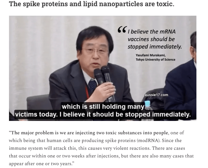 Professor Yasufami Murakami of the Tokyo University of Science declared; “I believe it (the mRNA COVID-19 injection) should be STOPPED immediately. THE SPIKE IS TOXIC. It is very clear what happens when you administer a toxic gene to a human. Another point is that the lipid nanoparticles are also toxic.”