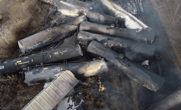 A Norfolk Southern train crashed in East Palestine, Ohio, a village near the Pennsylvania border and the Appalachian foothills, on February 3, 2023. Dozens of train cars derailed, at least 11 of which were carrying hazardous materials, some of which caught fire after the accident and burned for days. Fearing a large-scale explosion, authorities drained the vinyl chloride from five cars into a trench and set it alight in a controlled burn.