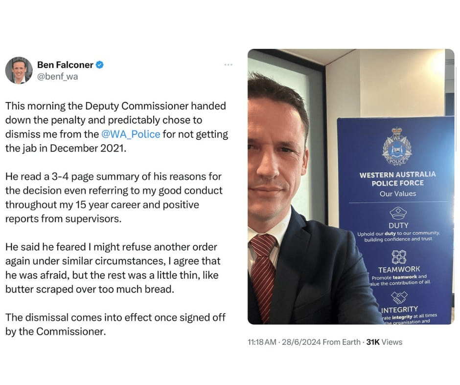 Two years after the Covid mandates ended, the West Australian Police Force has fired nearly 20 unvaccinated police officers and public servants for refusing to get the jabs.